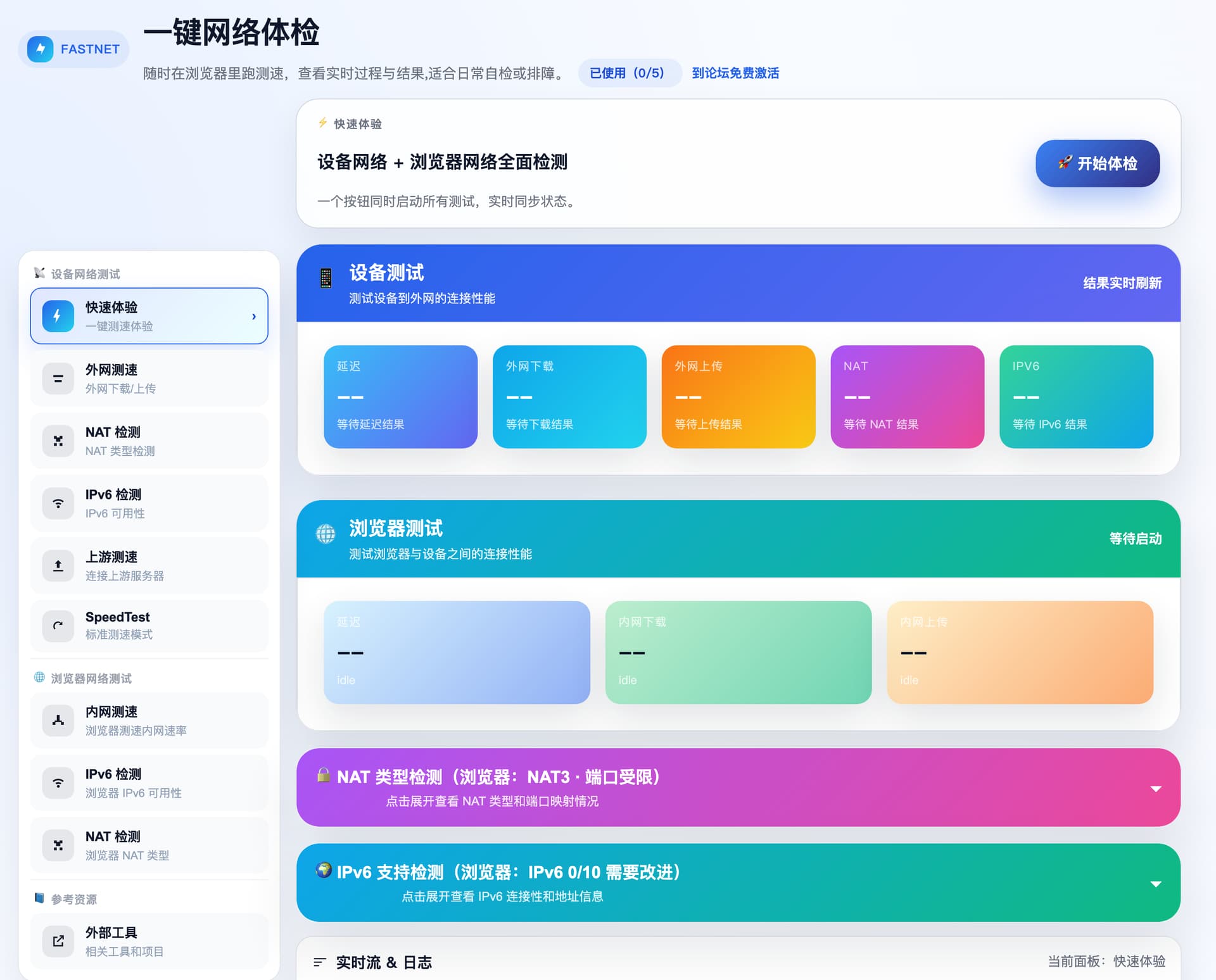 无论你是想快速了解当前网络质量,还是需要详细分析 NAT 类型与 IPv6 支持,FastNet 都能通过简洁的界面、一键式操作,为你提供实时、全面的网络健康报告。