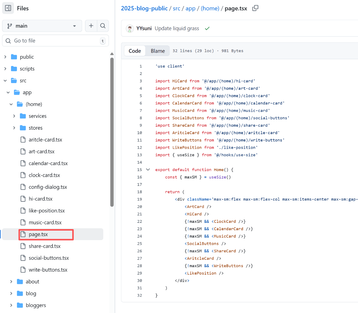 首页的内容现在只能前端配置一部分,所以代码更改在 src/app/(home) 目录,这个目录代表首页所有文件。首页的具体文件为 src/app/(home)/page.tsx