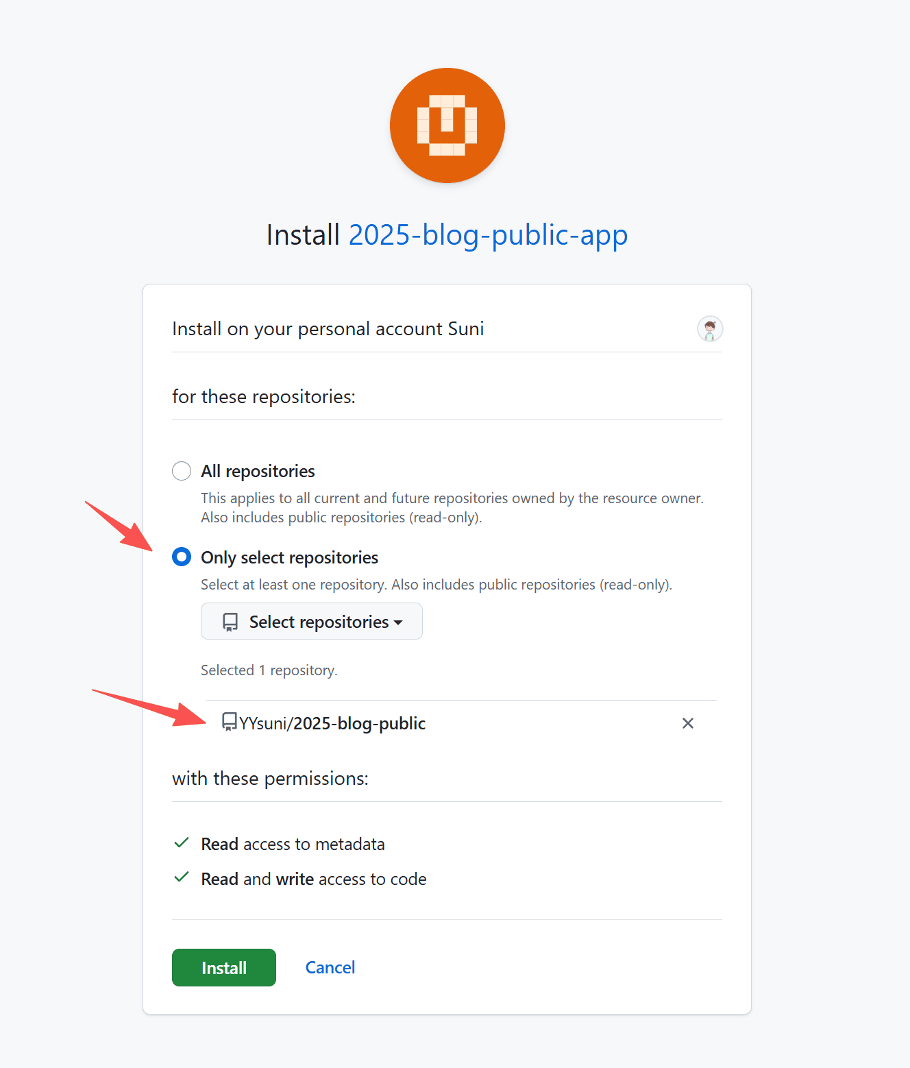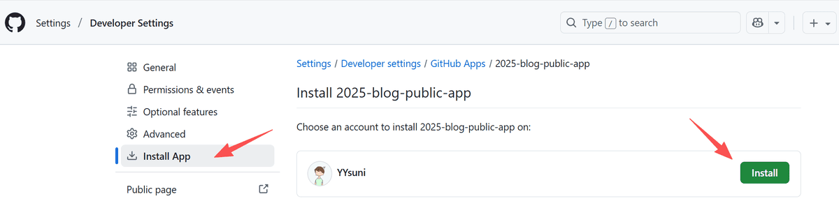 点击安装,就完成了 Github App 管理该仓库的权限设置了。下一步就是让前端知道推送那个项目,就是最开始提到的环境变量。(如果你不会设置环境变量,直接改仓库文件 src/consts.ts 也行。因为是公开的,所以环境变量意义也不大)