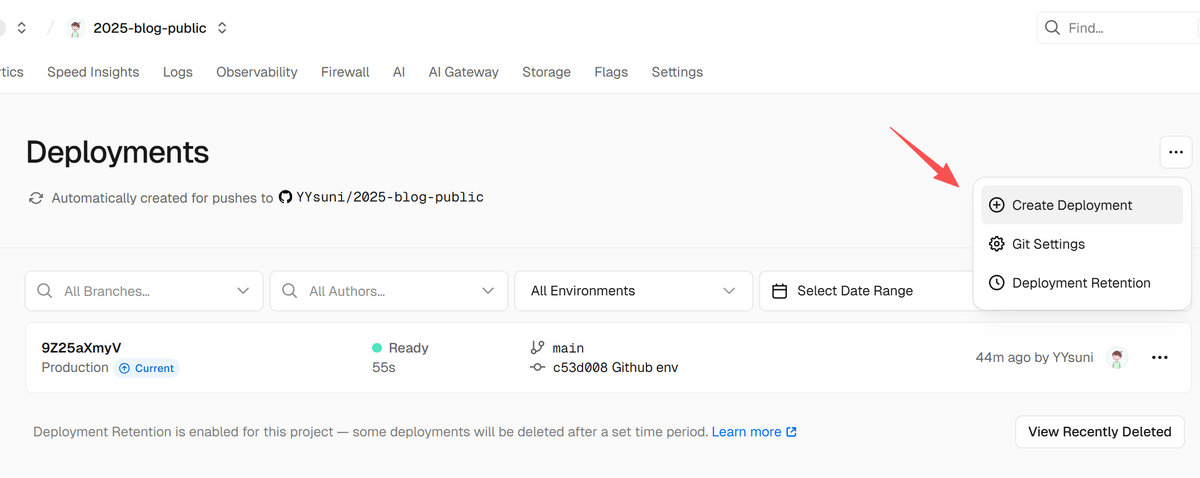 大约 60 秒会部署完成,有一个直接 vercel 域名,如:https://2025-blog-public.vercel.app/